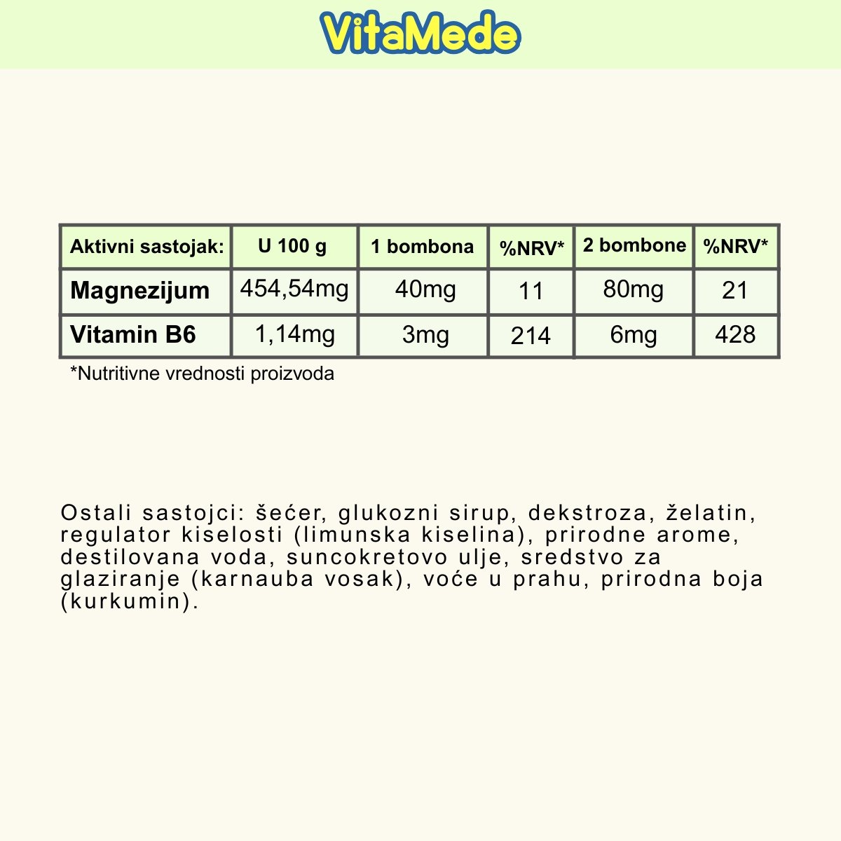 VitaMede Magnezijum + Vitamin B6 je dodatak ishrani. Dodaci ishrani nisu zamena za raznovrsnu i uravnoteženu ishranu i zdrav način života.